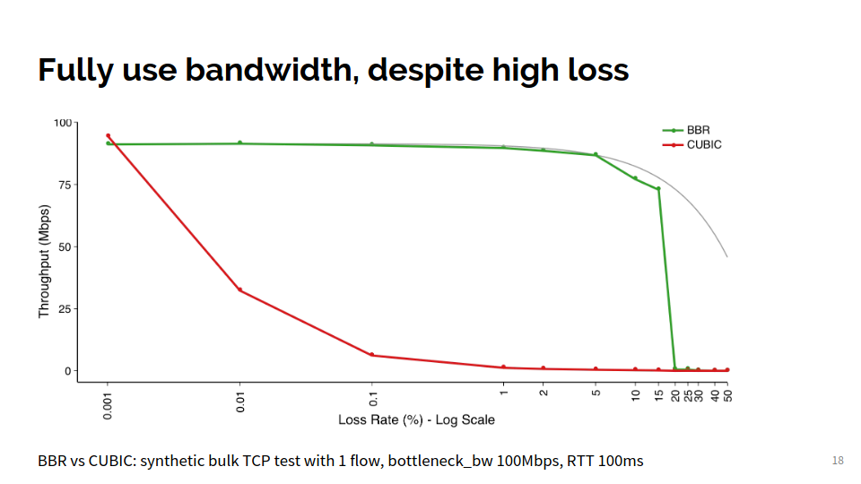 The slide below from Google made especially clear that BBR maintains good throughput with varying levels of packet loss, whereas CUBIC quickly deteriorates under similar conditions.