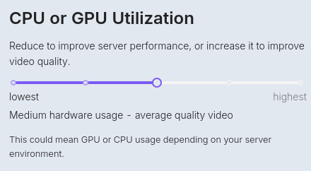 The key is to experiment and find the right balance where you are using the slowest encoder preset possible without overloading your server. In Owncast, the encoder preset is controlled for each output variant using the "CPU or GPU Utilization" slider shown below. Conduct several test streams, gradually increasing the encoder preset while monitoring CPU usage. Ideally, you want to use most of your CPU without hitting 100%, leaving some headroom for fluctuations in encoding demand and other system processes. Keep in mind that different types of content can impact CPU usage; mostly static video requires less processing than high-motion gameplay footage. If your CPU struggles to handle the encoder preset level you want, it may be time to consider an upgrade.