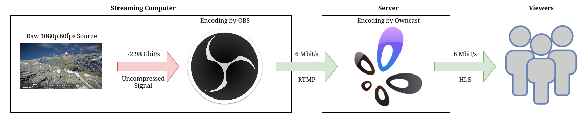 Let's consider the diagram below of an average Owncast setup based on how streamers typically interpret the documentation. First, we start with a raw, uncompressed video signal which we want to capture and stream to viewers. Uncompressed video requires an enormous amount of bandwidth, approximately 2.98 Gbit/s for 1080p at 60 fps, which far exceeds the capabilities of most networks. To make transmission feasible, broadcasting software, like Open Broadcaster Software, processes the signal and encodes it using a video encoder to significantly reduce the bitrate. In this case, it is set to 6,000 kbit/s. The compressed video signal is then transmitted over a network to a server running Owncast where it undergoes another round of encoding. Owncast re-encodes the video, also at 6,000 kbit/s, and generates the final stream which is delivered to viewers over a network.